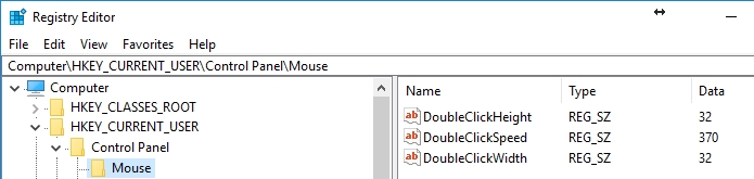 Windows Registry Editor Version 5.00 [HKEY_CURRENT_USER\Control Panel\Mouse] "DoubleClickHeight"="32" "DoubleClickSpeed"="370" "DoubleClickWidth"="32"